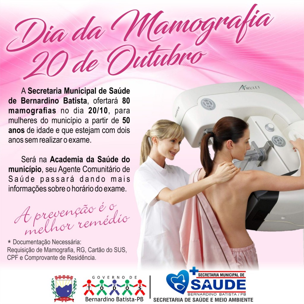 A Secretaria Municipal de Saúde de Bernardino Batista, ofertará 80 mamografias no dia 20/10, (domingo) com início às 8:00 horas para mulheres do município a partir de 50 anos de idade e que estejam com dois anos sem realizar o exame.