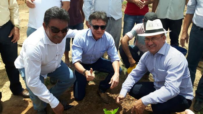 A primeira muda foi plantada pelo Presdidente da EMATER- Gestão unificada e pelos prefeitos que estiveram presentes também ao campo do projeto que contemplará os 50 agricultores familiares.