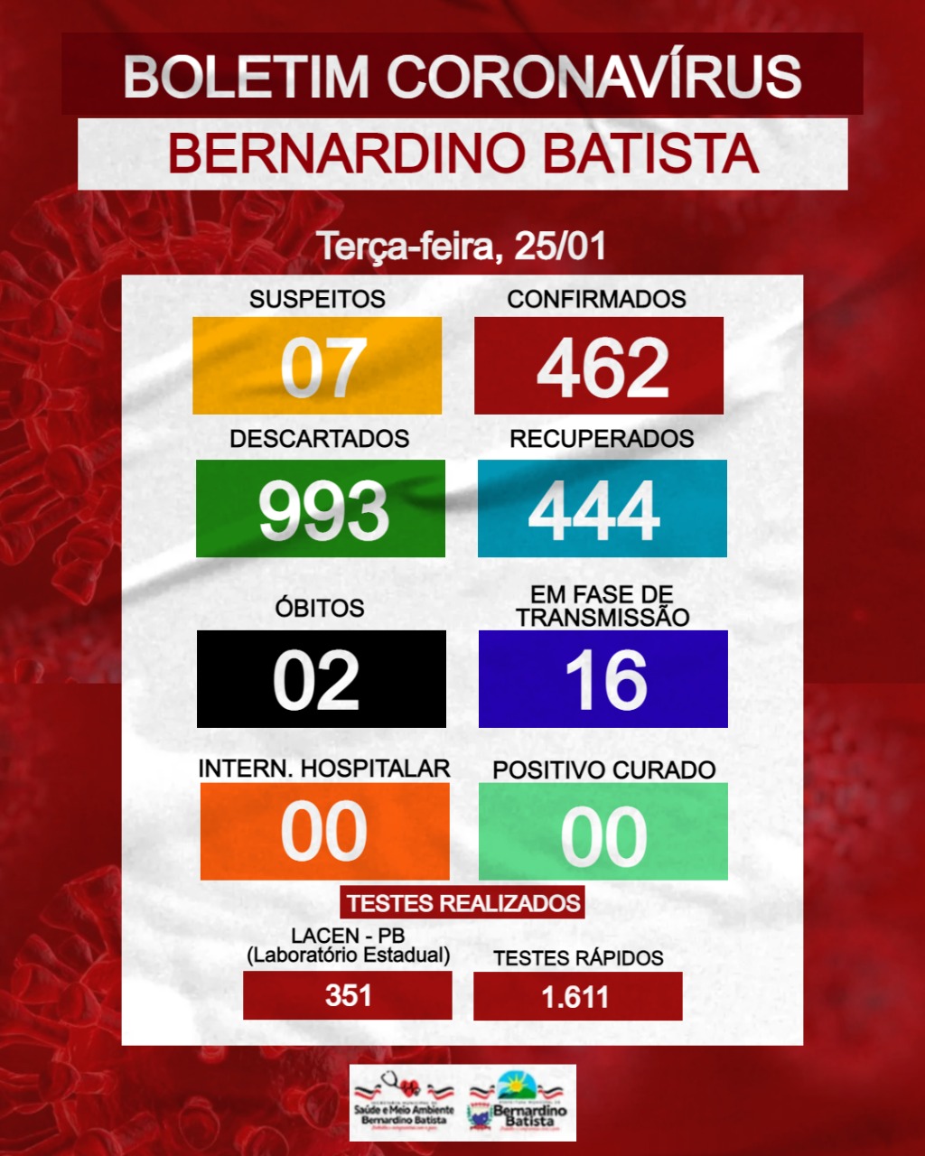 A Secretaria de Saúde e meio ambiente de Bernardino Batista, por meio da Vigilância epidemiológica, informa que até esta terça feira (25), a cidade totaliza 462 casos confirmados.