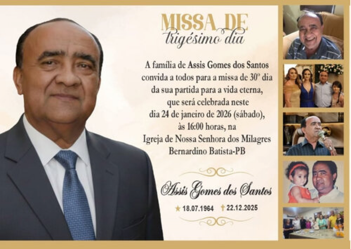 A família do ex-prefeito de Bernardino Batista, Assis Gomes dos Santos, convida a população para a missa de 30º dia em memória de sua vida e trajetória pública. A celebração será realizada neste sábado, 24 de janeiro de 2026, às 16h, na Igreja de Nossa Senhora dos Milagres, no município de Bernardino Batista, no Sertão da Paraíba.