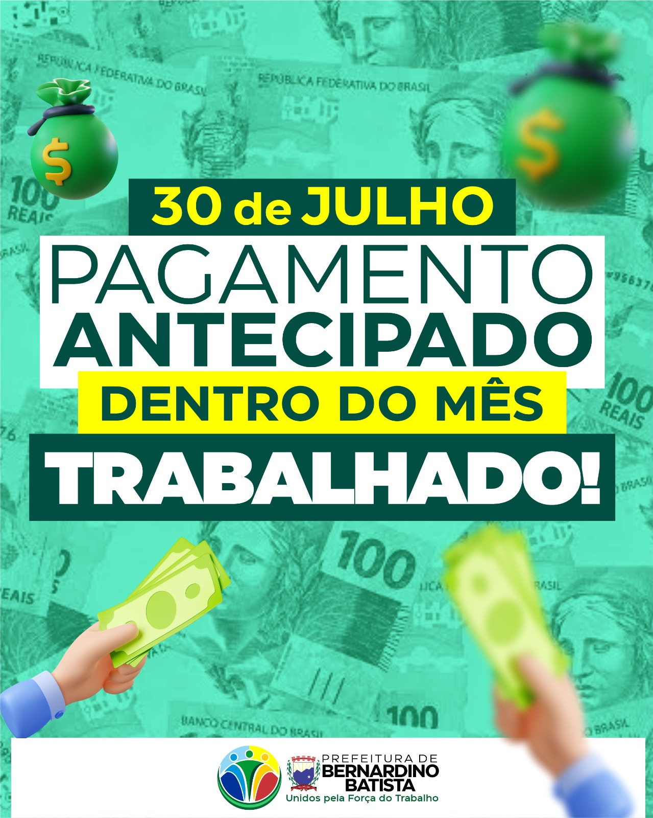 O prefeito de Bernardino Batista, Aldo Andrade, anunciou para a tarde  desta quarta-feira (30) o pagamento dos salários referentes ao mês de julho para todos os servidores municipais. O pagamento, realizado ainda dentro do mês trabalhado, reforça o compromisso da gestão com a valorização do funcionalismo público e a responsabilidade fiscal.