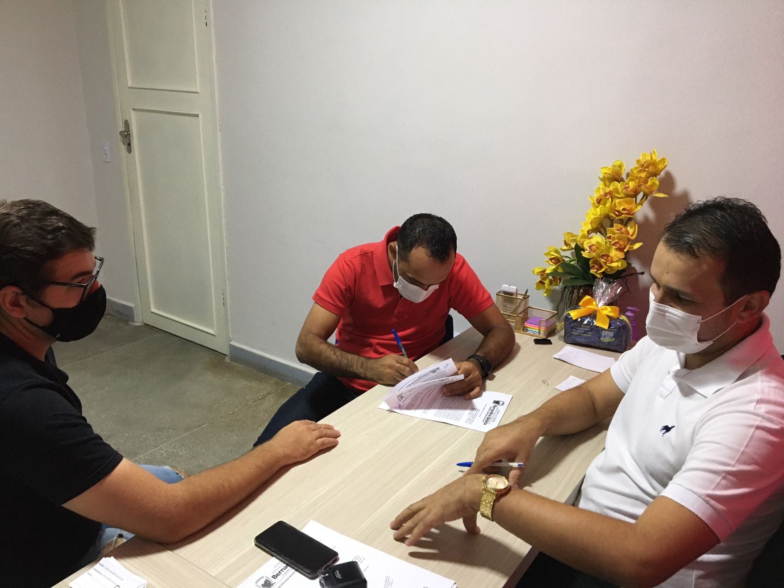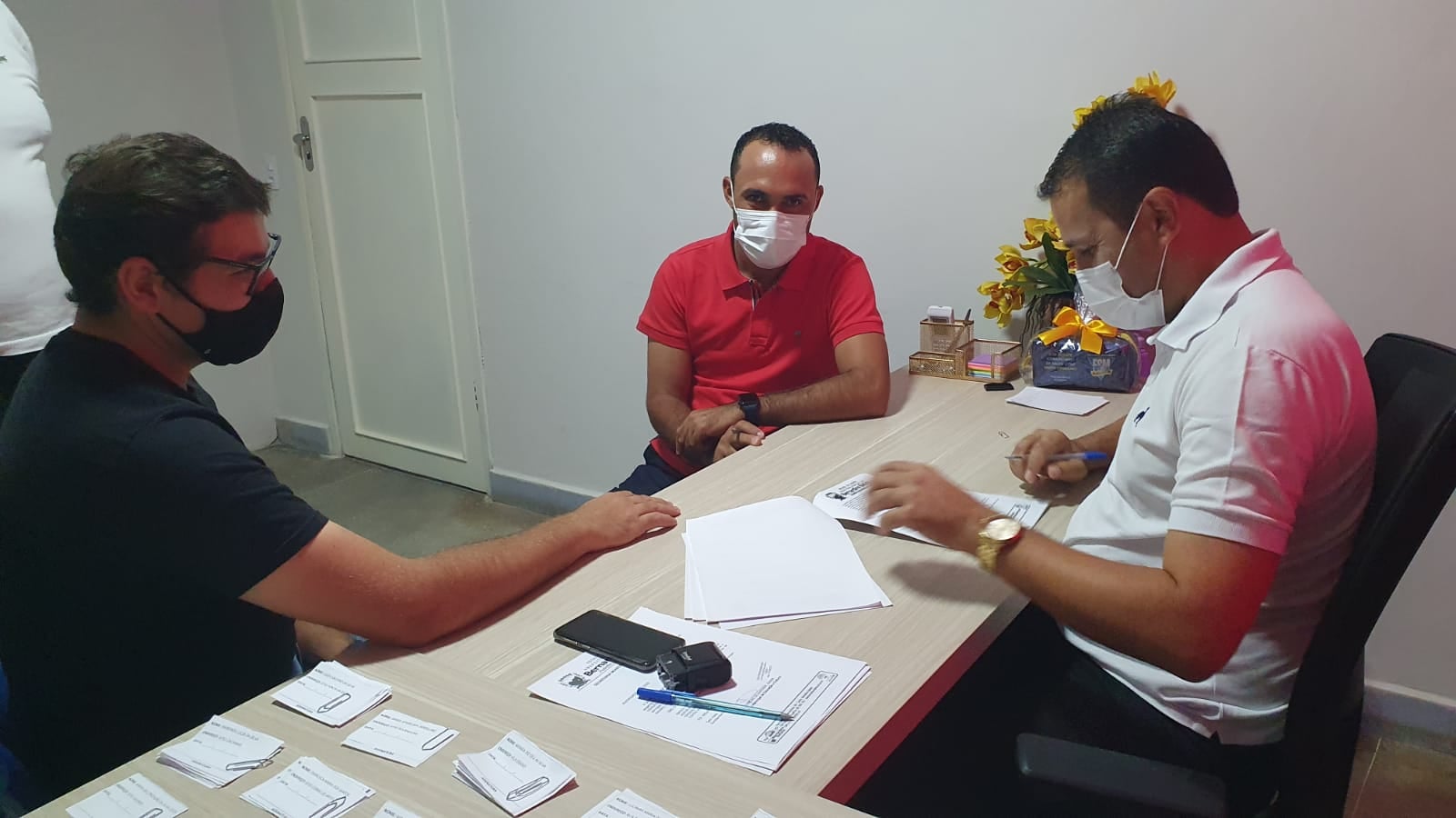 O prefeito de Bernardino Batista, Aldo Andrade recebeu representantes da empresa Dois Irmãos para assinatura de contrato para reforma e ampliação da praça pública da vila Egídio, zona rural do município.