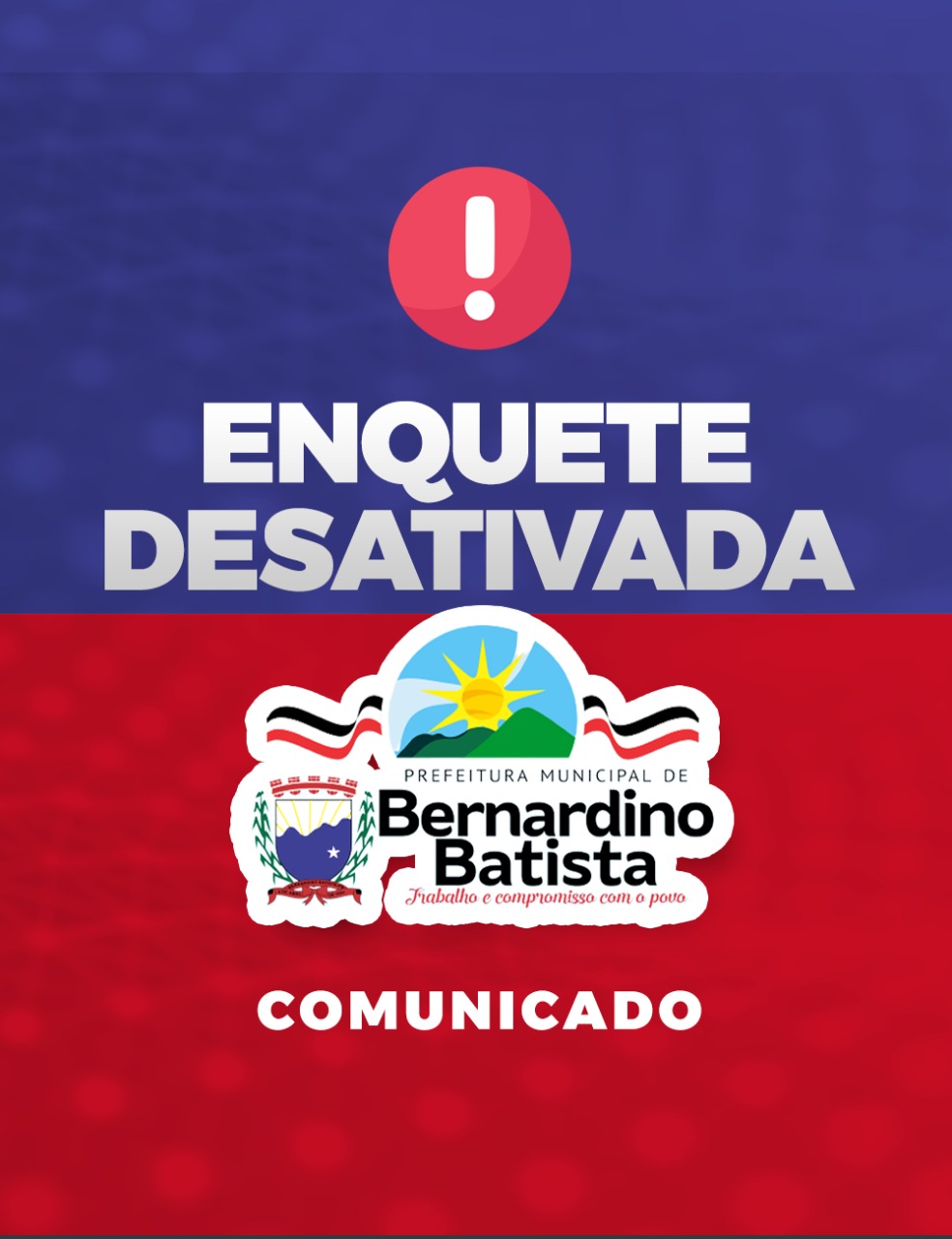 A assessoria técnica que administra o site da Prefeitura Municipal de Bernardino Batista/PB, vem, informar, que a enquete relativa a escolha das atrações musicais da Festa de Emancipação Política do Município fora desativada, vez que o alto índice de votos causou o congestionamento da página, transtornando o sistema de votação virtual.