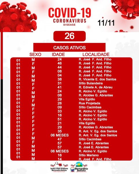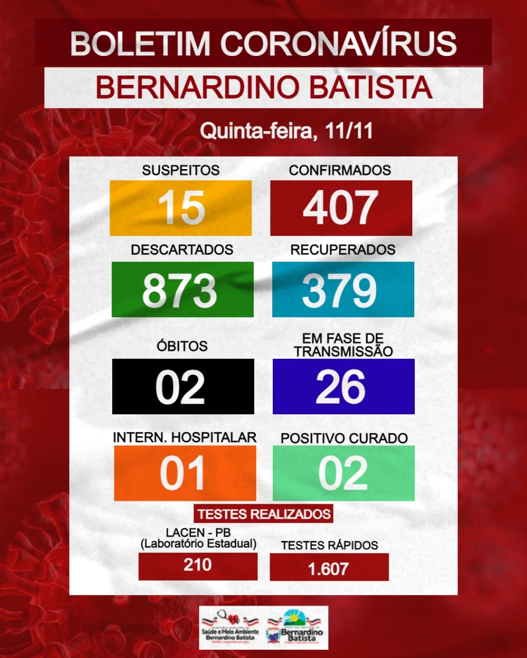 A Secretaria de Saúde e meio ambiente de Bernardino Batista, por meio da Vigilância epidemiológica, informa que até nesta Quinta-Feira (11/11), a cidade totaliza 407 casos confirmados.