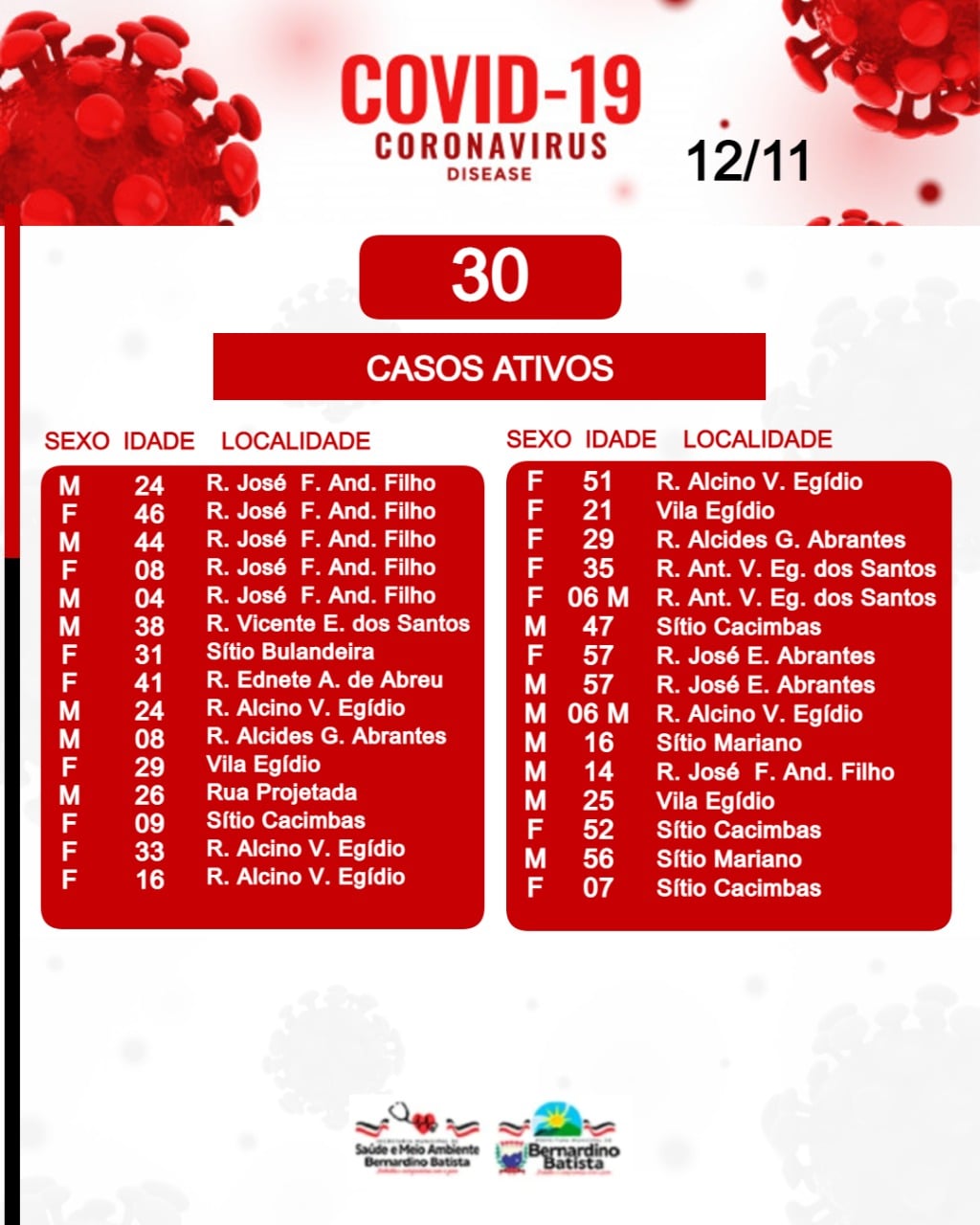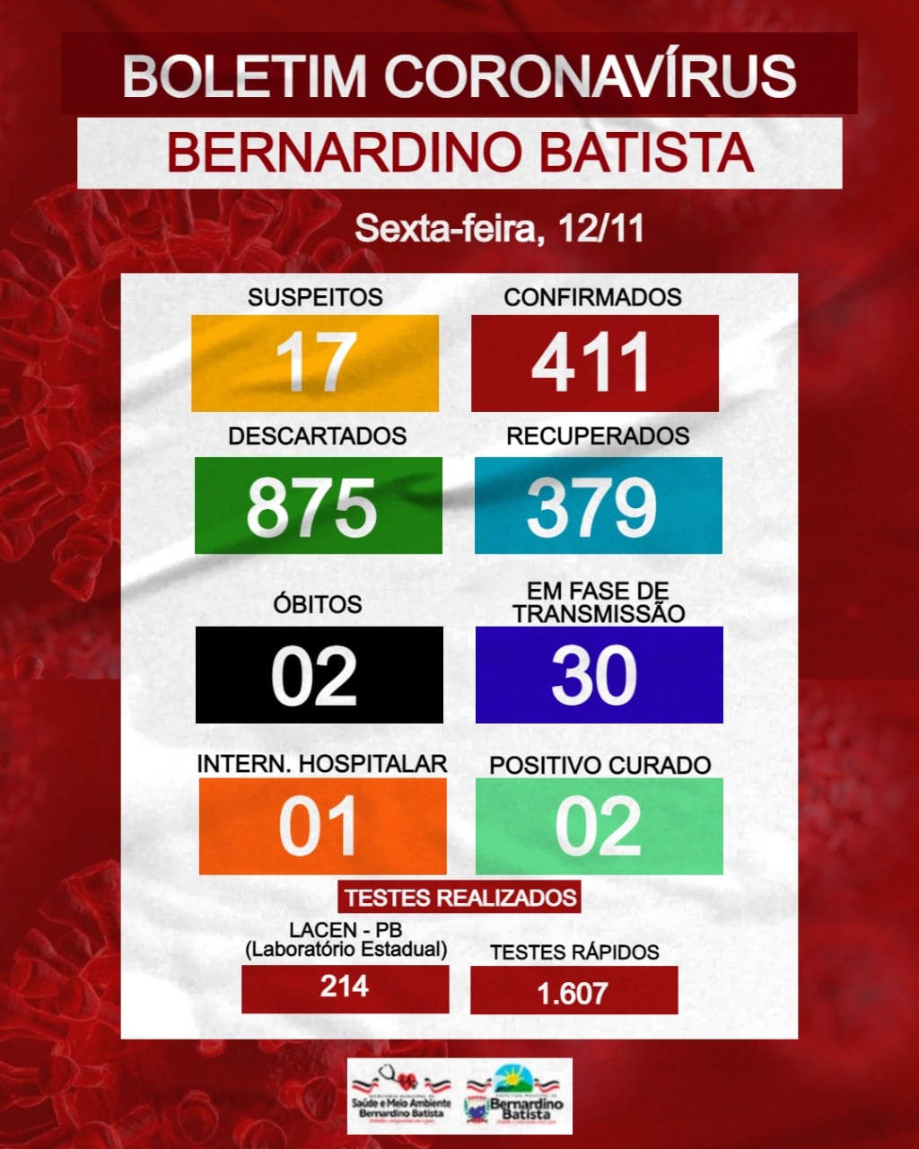 A Secretaria de Saúde e meio ambiente de Bernardino Batista, por meio da Vigilância epidemiológica, informa que até nesta Sexta-Feira (12/11), a cidade totaliza 411 casos confirmados.