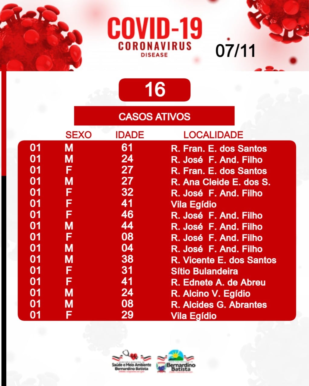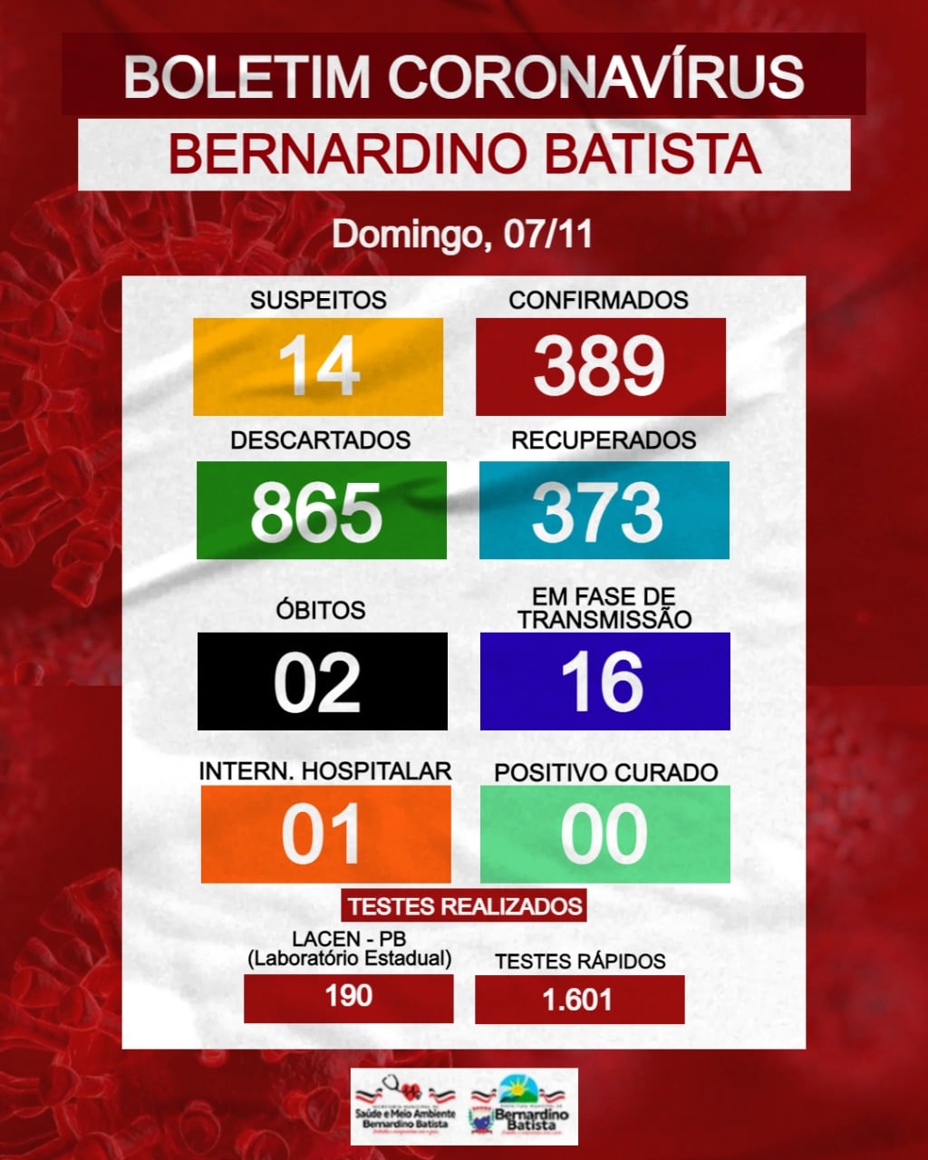 A Secretaria de Saúde e meio ambiente de Bernardino Batista, por meio da Vigilância epidemiológica, informa que até neste Domingo (07/11), a cidade totaliza 389 casos confirmados.