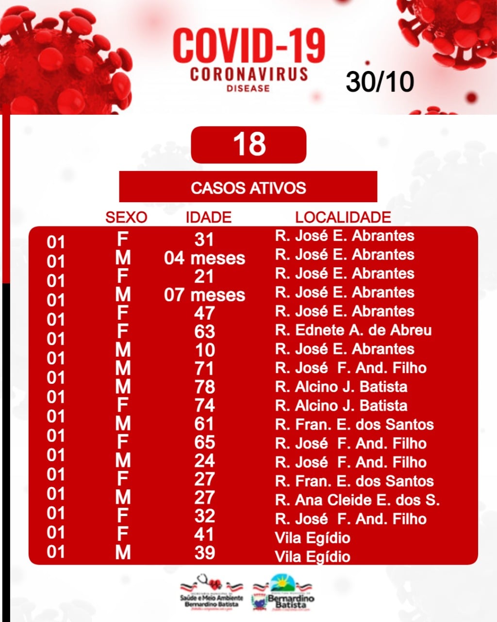 A Secretaria de Saúde e meio ambiente de Bernardino Batista, por meio da Vigilância epidemiológica, informa que até este Sábado (30/10), a cidade totaliza 378a casos confirmados.