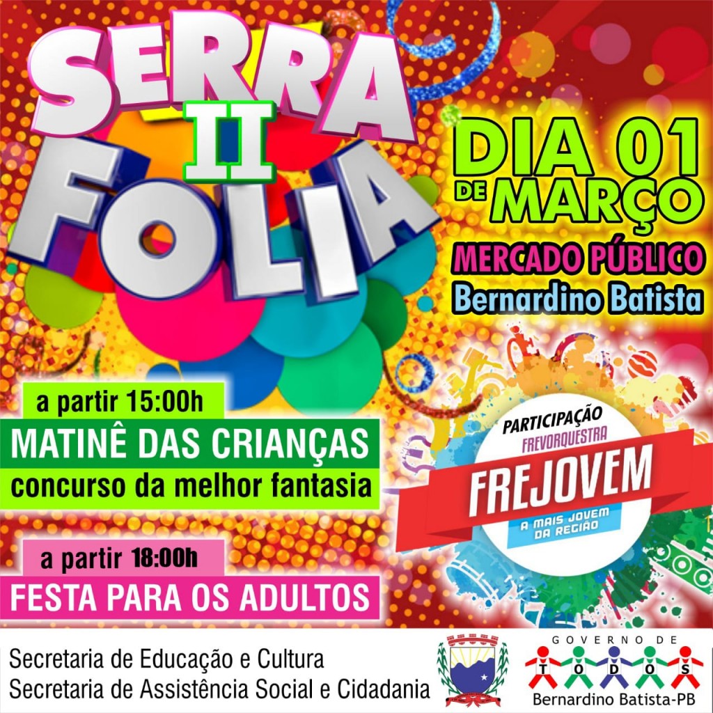 A secretaria municipal de Educação e cultura em  secretaria de assistência social e cidadania com o apoio da prefeitura municipal de Bernardino Batista realizarão mais uma edição das festividades carnavalescas no muncipio para comtemplar a cidade.